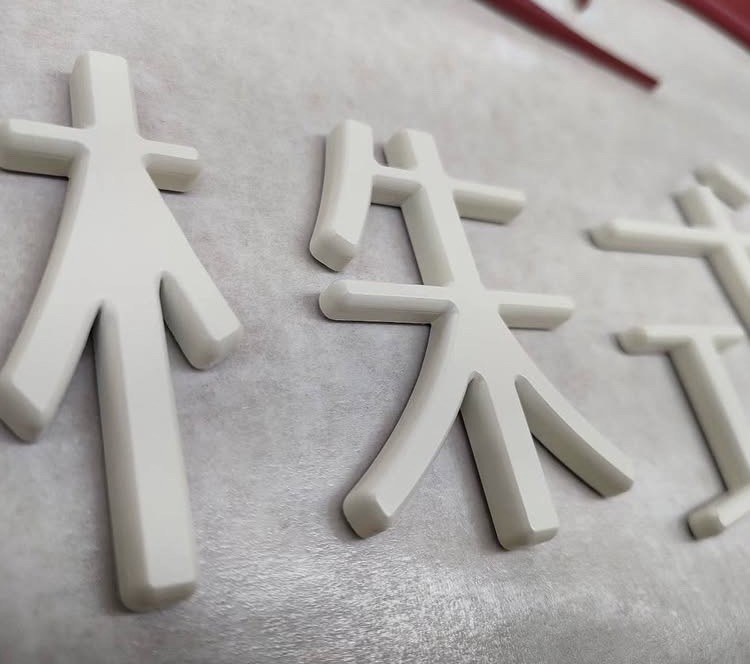 「カルプ」と呼ばれる発泡ウレタン樹脂(密度の高いスポンジのようなもの)を使用して表面に塩ビパネルを貼り付けて仕上げた箱文字。厚みは5㎜・15㎜・30㎜