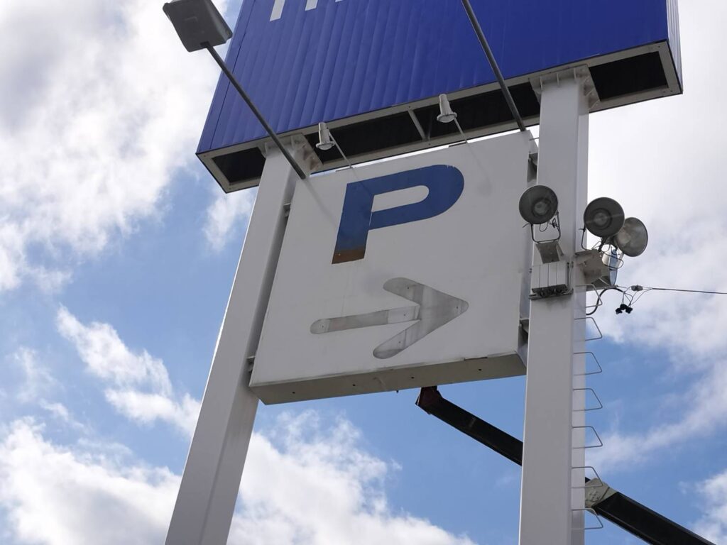 目の前の道路を通る方に向けて店舗がわかるように店名を残しつつも閉店の告知を行う為に自立看板下部に記載されていた駐車場案内の矢印やPの文字を撤去させて頂きこちらを使用させて頂きました。