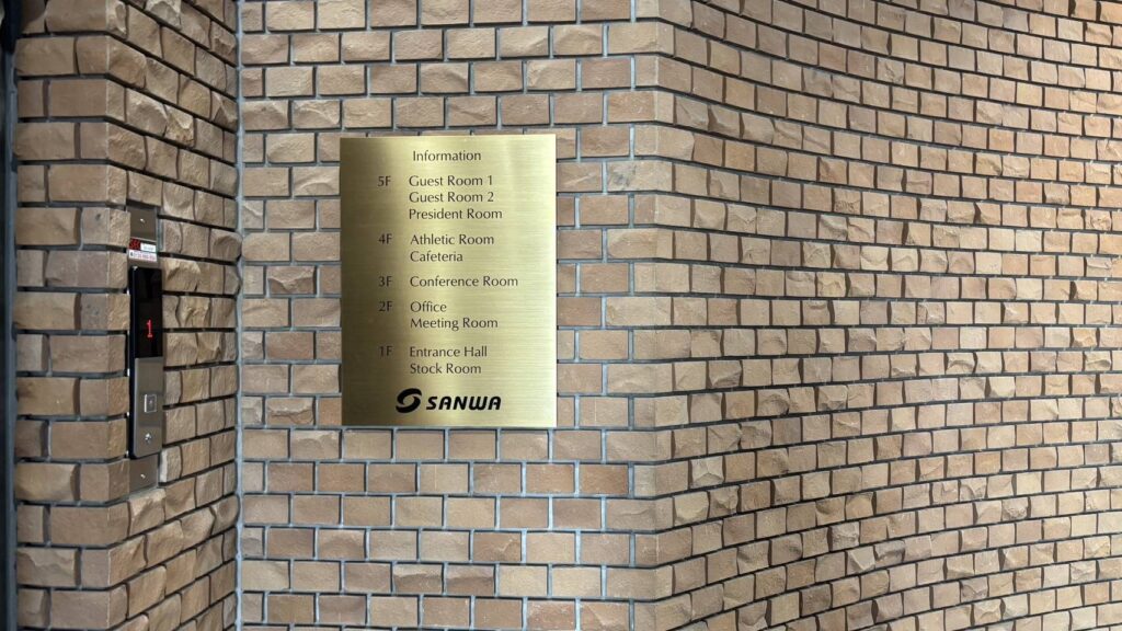 室内のエレベーターホールにはフロア名をカッティングシートで用意させて頂き金色の真鍮パネルに貼って取付を行いました。