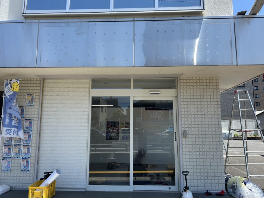 今回の工事で入口上部の壁面看板がサイズ変更になったことから壁にピッタリと合うサイズに納める為に現場確認と採寸を行わせて頂き綺麗に仕上げる事ができました。