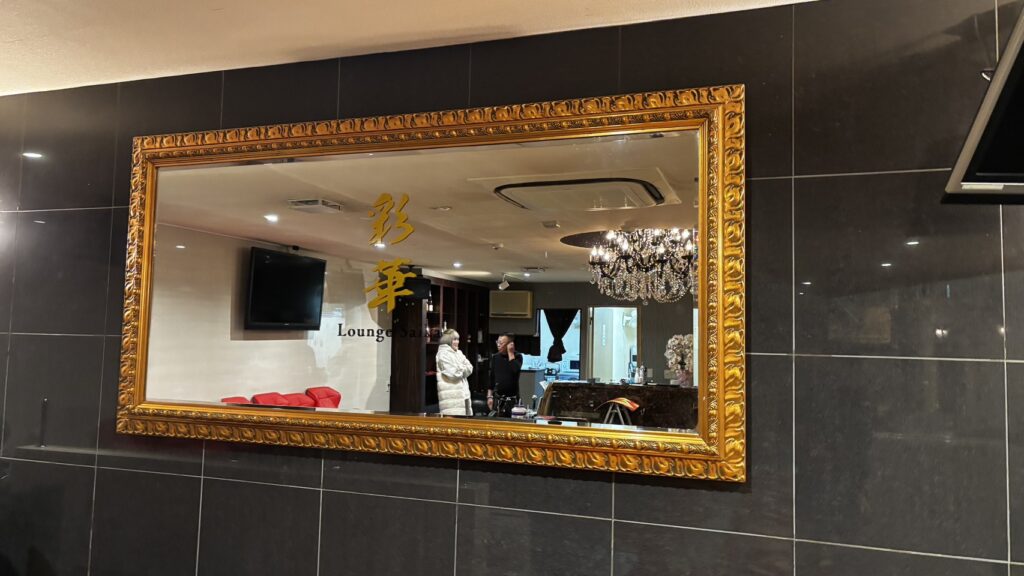室内の鏡には装飾用に入口に施工したものと同じ店名のシートを貼らせて頂きました。