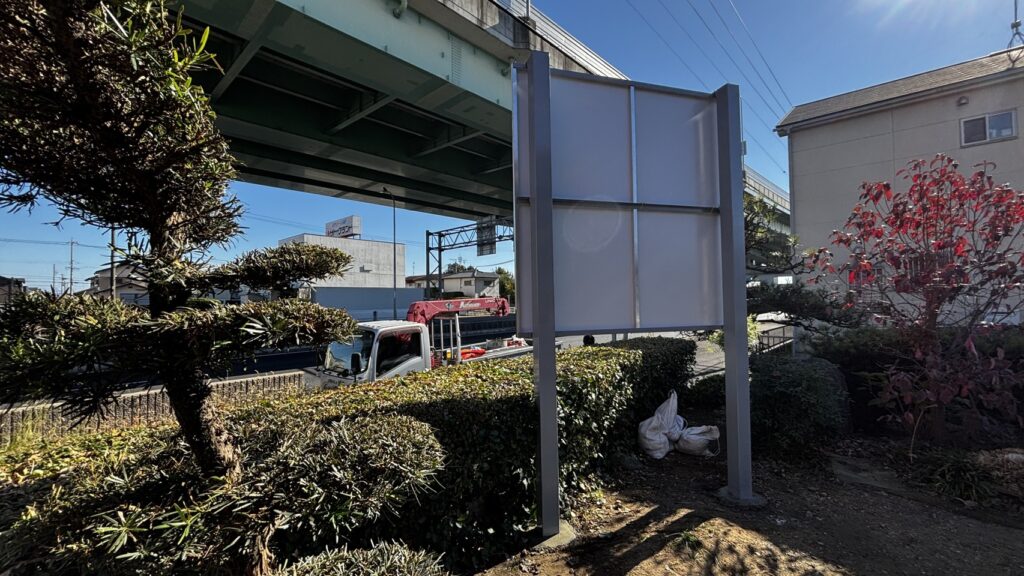 今回もお客様よりお送り頂いたシートサイズに合わせたパネルと鉄骨を用意させて頂きご指定の位置に看板を設置させて頂きました。