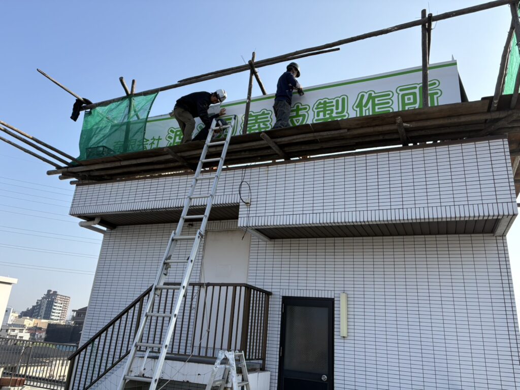 愛知県名古屋市千種区にて塔屋看板の改修工事に伺わせて頂きました!