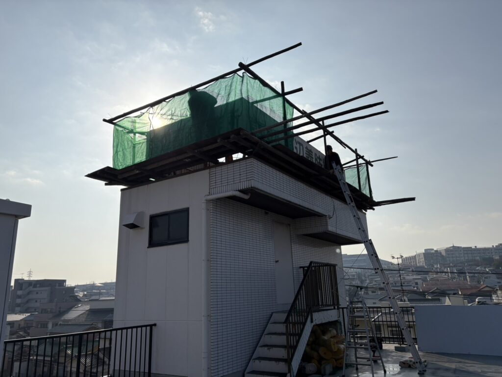 看板の設置箇所が4階の上だった事と4面のうち2面の方向に住宅があり高所作業車を停めて作業をすることができない現場だったので今回は足場をかけて作業をさせて頂きました。