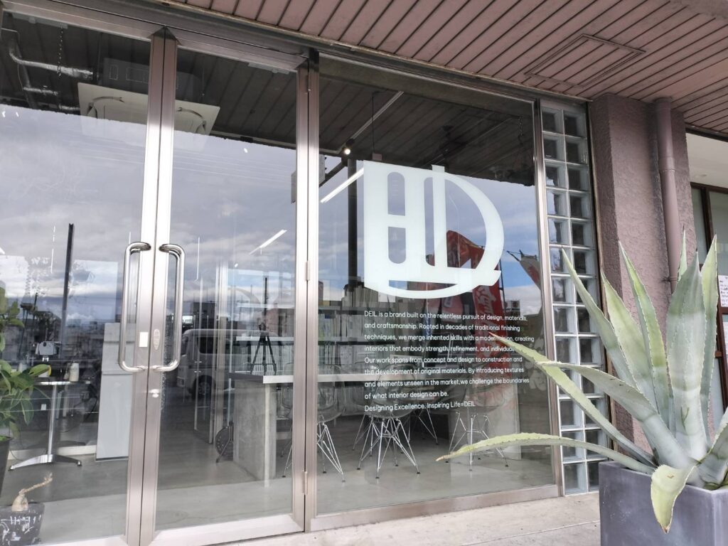 窓ガラスのカッティングシートは社名ロゴの下に入っていたURLを剥がしお客様より頂いた会社説明を英語表記したものを室内側から貼り付けさせて頂きました。