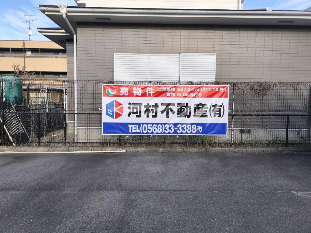 今回販売する物件は国道19号線沿いに面しており視認性が良い事から車の進行方向側には木製の自立看板を設置し建物側のフェンスには横幅3mの横断幕を取り付けて物件のアピールができるようになっております。