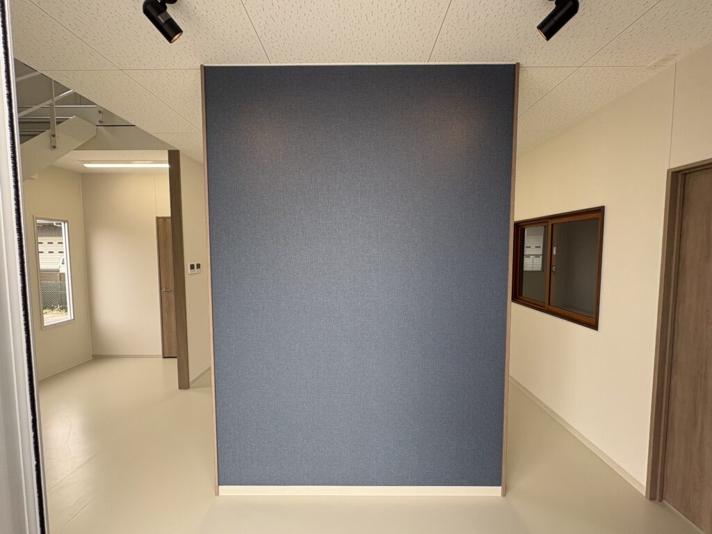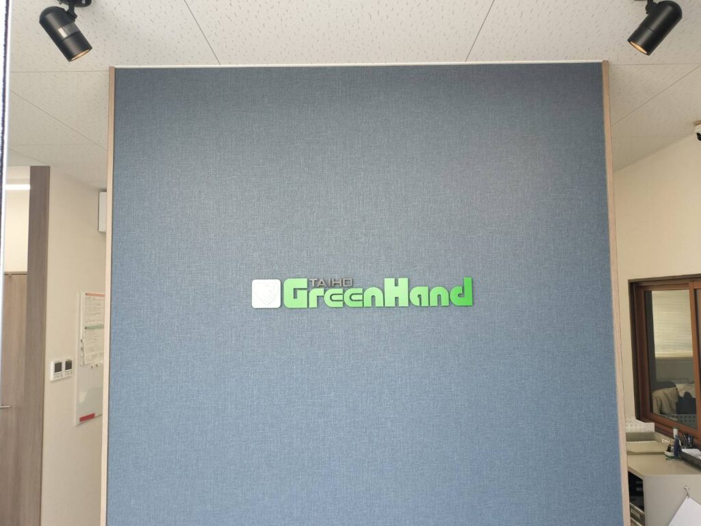 入口正面につけてある事で来社されるお客様へロゴマークのアピールができるようになっており壁面を装飾しつつも企業様をアピールできるようになっております。