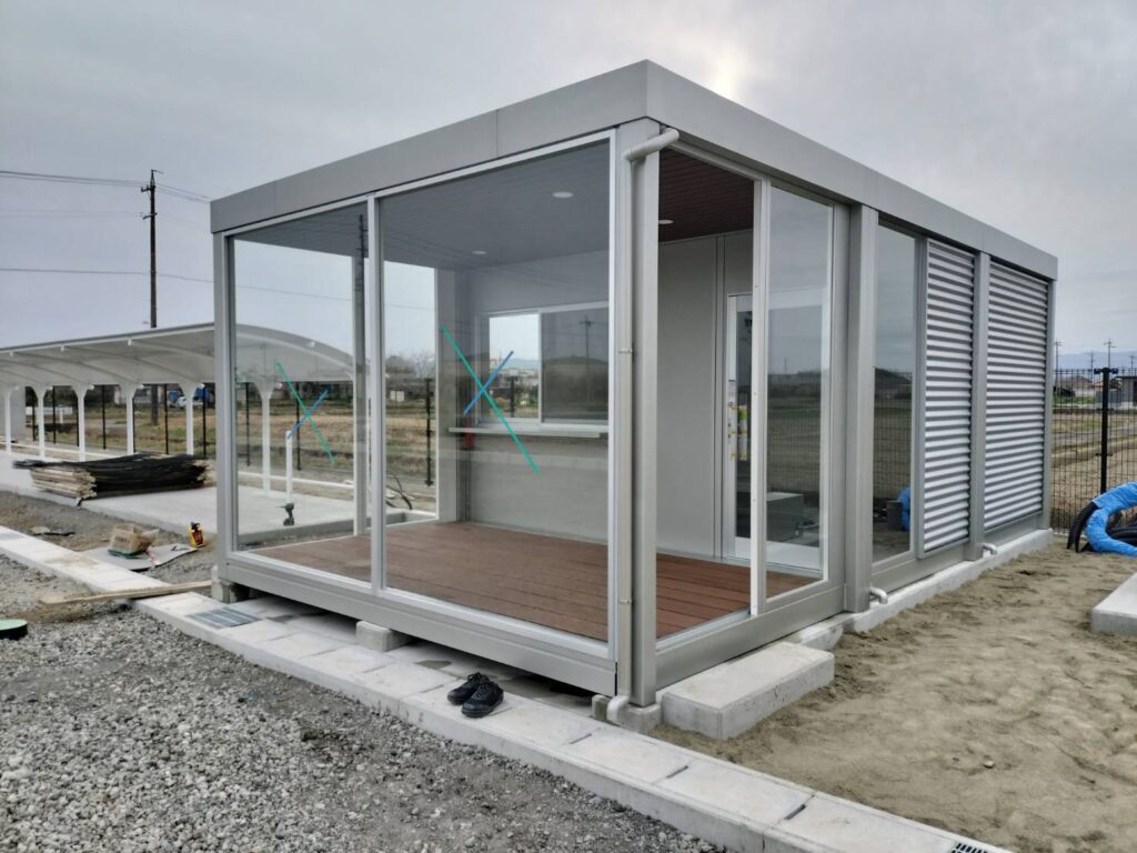 今回は人や物がガラスにぶつかった際にガラスが飛散する事を防止する目的で建物のFIXガラスすべてに透明飛散防止フィルムを貼り付けさせて頂きました。